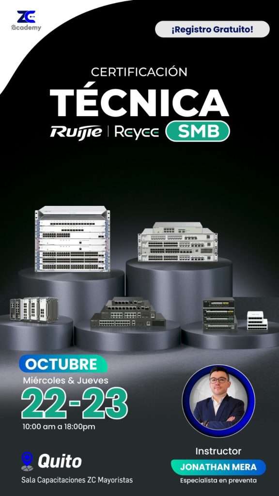 RUIJIE | PRESENCIAL | JONATHAN MERA | "CERTIFICACIÓN TÉCNICA SMB" | 22/10/2025 | 8 HORA | 10:00 A 18:00 | REGÍSTRATE |