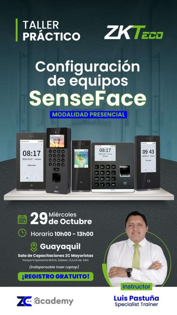 ZKTECO | PRESENCIAL | LUIS PASTUÑA | "CONFIGURACIÓN DE EQUIPOS SENSEFACE" | 29/10/2025 | 3 HORA | 10:00 A 13:00 | REGÍSTRATE |