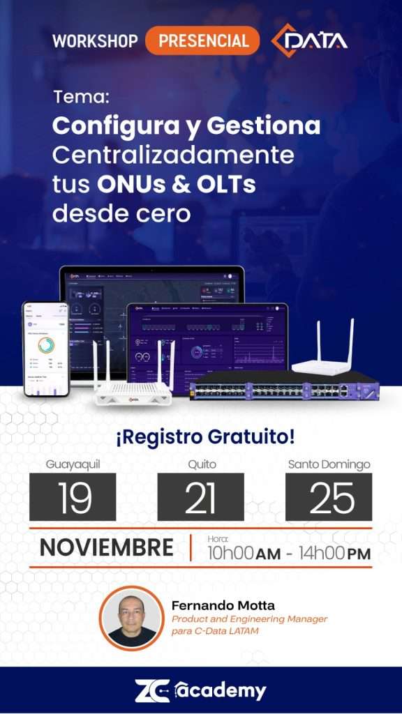| C-DATA | PRESENCIAL | FERNANDO MOTTA | "CONFIGURA Y GESTIONA CENTRALIZADAMENTE TUS ONUs & OLTs DESDE CERO " | 19/11/2025 | 4 HORA | 10:00 A 14:00 | REGÍSTRATE |