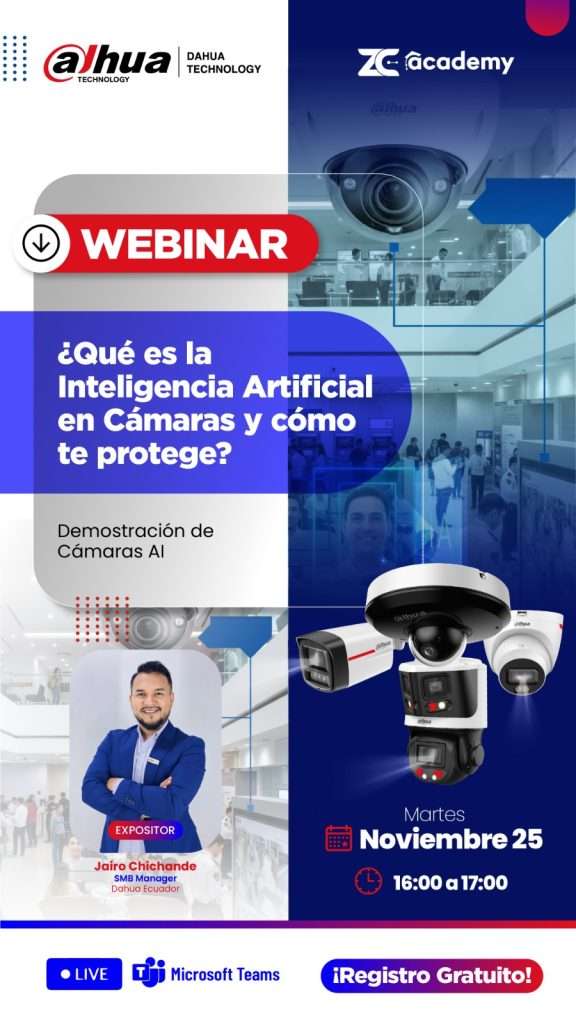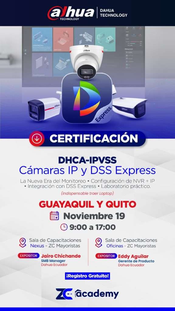 | DAHUA | GUAYAQUIL PRESENCIAL | JAIRO CHICHANDE -EDDY AGUILAR | " DHCA-IPVSS | CAMARAS IP & DSS EXPRESS" | 19/11/2025 | 8 HORA | 09:00 A 17:00 | REGÍSTRATE |
