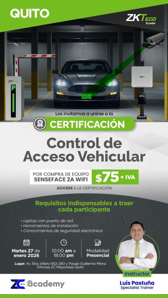 | ZKTECO | PRESENCIAL | LUIS PASTUÑA | "CONTROL DE ACCESO VEHICULAR" | 27/01/2026 | 8 HORA | 10:00 A 18:00 | REGÍSTRATE |