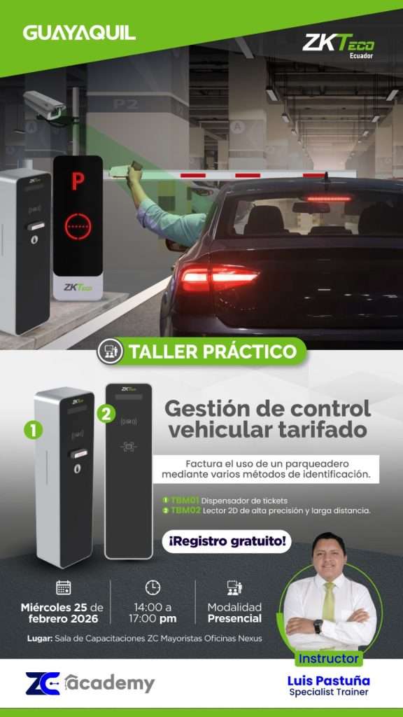| ZKTECO | PRESENCIAL | LUIS PASTUÑA | GESTIÓN DE CONTROL VEHICULAR TARIFADO | 25/02/2026 | 3 HORA | 14:00 A 17:00 | REGÍSTRATE |